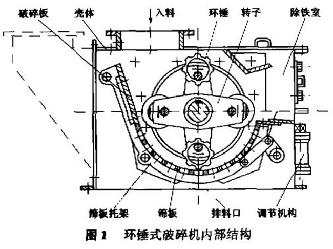 從以上KRC800環錘式破碎機結構圖我們看到,設備的主軸上安裝有數排掛錘體,在其圓周的銷孔上貫穿著銷軸,用銷軸將錘頭鉸接在各排掛錘體之間,錘頭磨損后可調換工作面。掛錘體上開有兩個銷孔。銷孔至回轉軸心的距離是不同的,可以用來調整錘頭和篦條之間的間隙。轉子兩段支撐在滾動軸承上,軸承有螺栓固定在機殼上。主軸和電動機用彈性聯軸器連接。
