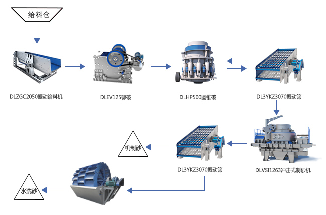 河卵石硬度較高,破碎環節可以選用鄂破+圓錐破兩段破碎工藝,制砂環節可用2臺沖擊式制砂機,工藝流程為:河卵石原料經振動給料機均勻輸送給顎式破碎機進行粗碎,粗碎后的物料直接輸送到圓錐破進行中碎,中碎后的物料再被輸送到2臺沖擊式制砂機進行制砂。