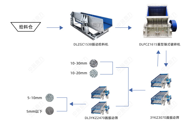 破碎環(huán)節(jié)只用一臺(tái)DLPCZ1615重型錘式破碎機(jī),既用來(lái)做粗碎,也用來(lái)加工頭道篩的返料,取代傳統(tǒng)兩段破碎,較大程度上減少設(shè)備投資成本,頭道篩出10-30mm、10-20mm兩種成品料,二道篩出5-10mm、5mm以下石粉兩種成品料。