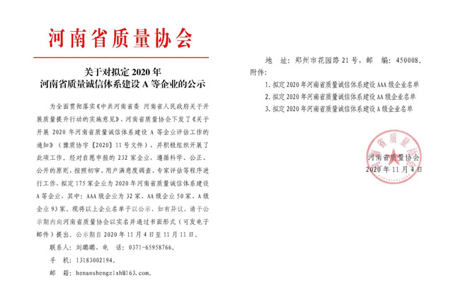 近日,新鄉(xiāng)市中譽鼎力軟件科技股份有限公司通過初審、用戶滿意度調(diào)查、評估等程序,成功入選“2020年河南省質(zhì)量誠信體系建設(shè)AA級企業(yè)”名單。