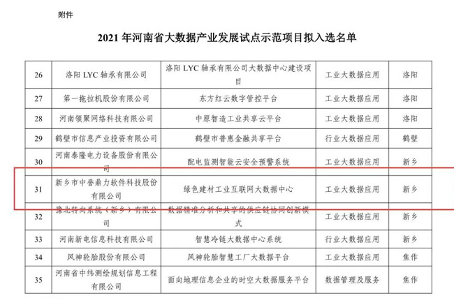 繼中譽鼎力智能礦山管理系統(tǒng)入選河南省制造業(yè)與互聯(lián)網(wǎng)融合發(fā)展試點項目名單之后,近日,中譽鼎力綠色建材工業(yè)互聯(lián)網(wǎng)大數(shù)據(jù)中心成功入選2021年河南省大數(shù)據(jù)產(chǎn)業(yè)發(fā)展試點項目名單!