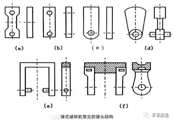 上圖中(a)、(b)、(c)是輕型錘頭,質量通常為3.5~15.0kg,多用于破碎塊度為100~200mm的軟質和中硬物料。其中(a)、(b)兩種是兩端帶孔的,磨損后可以調換4次;而(c)種錘頭只能換2次。(d)為中型錘頭,質量為30~60kg,且距懸掛較遠,多用于破碎800~1000mm的中硬物料;而(e)、(f)是重型錘頭,其質量為50~120kg,主要用來破碎大塊且堅硬的物料。