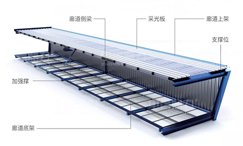 組裝式廊道采用模塊化設計,分體式加工,整體由廊道底架、廊道上架、廊道側梁、采光板、支撐位、加強撐等部位組成,不同部位運輸到項目現場進行組裝,可以大幅度縮短項目建設周期,同時減少建設成本。