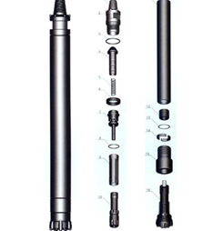 活塞、內缸、配氣座、逆止閥和鉆頭附件等安裝在細長的外缸內,外缸上端裝帶扳手口和聯接螺紋的上接頭,下端裝有螺紋連接的卡釬套。
