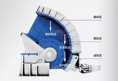 在第三反擊區(qū)的可調(diào)節(jié)反擊板上留出空隙,讓直徑小于空隙的物料直接自然流出,避免再次破碎,提升產(chǎn)能的同時,大大減少產(chǎn)粉率,是在物料合適的情況下是替代傳統(tǒng)反擊式破碎機的可選產(chǎn)品。