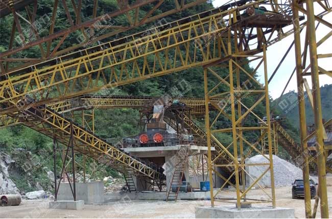 石料從山上爆破下來,經過卸料車將石料送進一臺ZGC1538振動給料機,振動給料機會把廢料篩分來,成品料質量。剩下的物料被送至PCZ1615型重型反擊錘式破碎機進行段破碎,經過一道2YKZ2460振動篩并篩,篩分出泥石粉和1-3碎石。剩下的料由輸送帶送至中轉料倉,從中轉料倉被送至一臺ZSJ1218雙轉子制砂機進行段破碎,再經過一道2YKZ2460振動篩并篩,篩分1-2碎石、瓜米碎石和0-5砂三種成品料,被輸送帶送到成品料區。