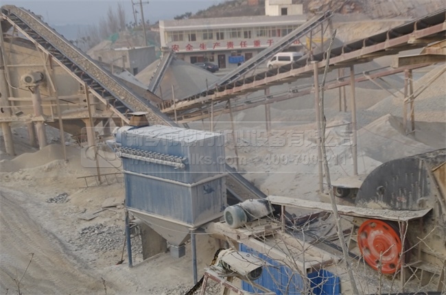 上圖是石料生產線生產現場,生產線上選用了我們公司生產的DMCA除塵器設備,可以用以吸收石料生產線中產生的粉塵,凈化了整體生產環境。