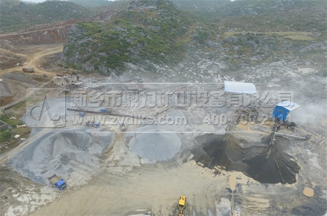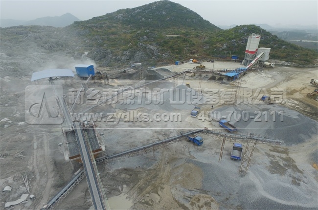 從這個時產350噸碎石制砂生產線圖集上可以看到,排列整齊的運輸車輛從生產線上將成品物料運送走,每一個出料口出產不同種類的成品物料,礦區道路被部硬化,保護了礦區的生產環境。
