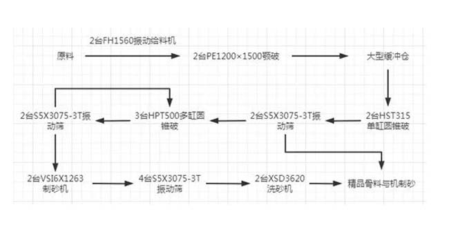 主機設備:PEW顎式破碎機、2臺PFW反擊破碎機、VSI6X制砂機