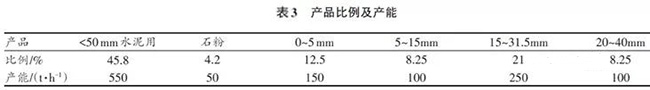 利用自有石灰石礦用配套投建年產百萬噸碎石生產線采取的重錘式破碎機+整形錘式破碎機,在不思考單獨制砂的情景下,產品份額及處理量見表3。