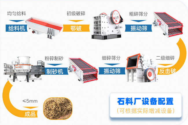 一般制砂生產線需要用到給料機、破碎機、篩分機、制砂機、輸送機、洗砂機等。依照不同用戶的原料、產能、出料、場地、預算等不同,以下就沖擊式制砂機成套設備中的主要設備進行介紹: